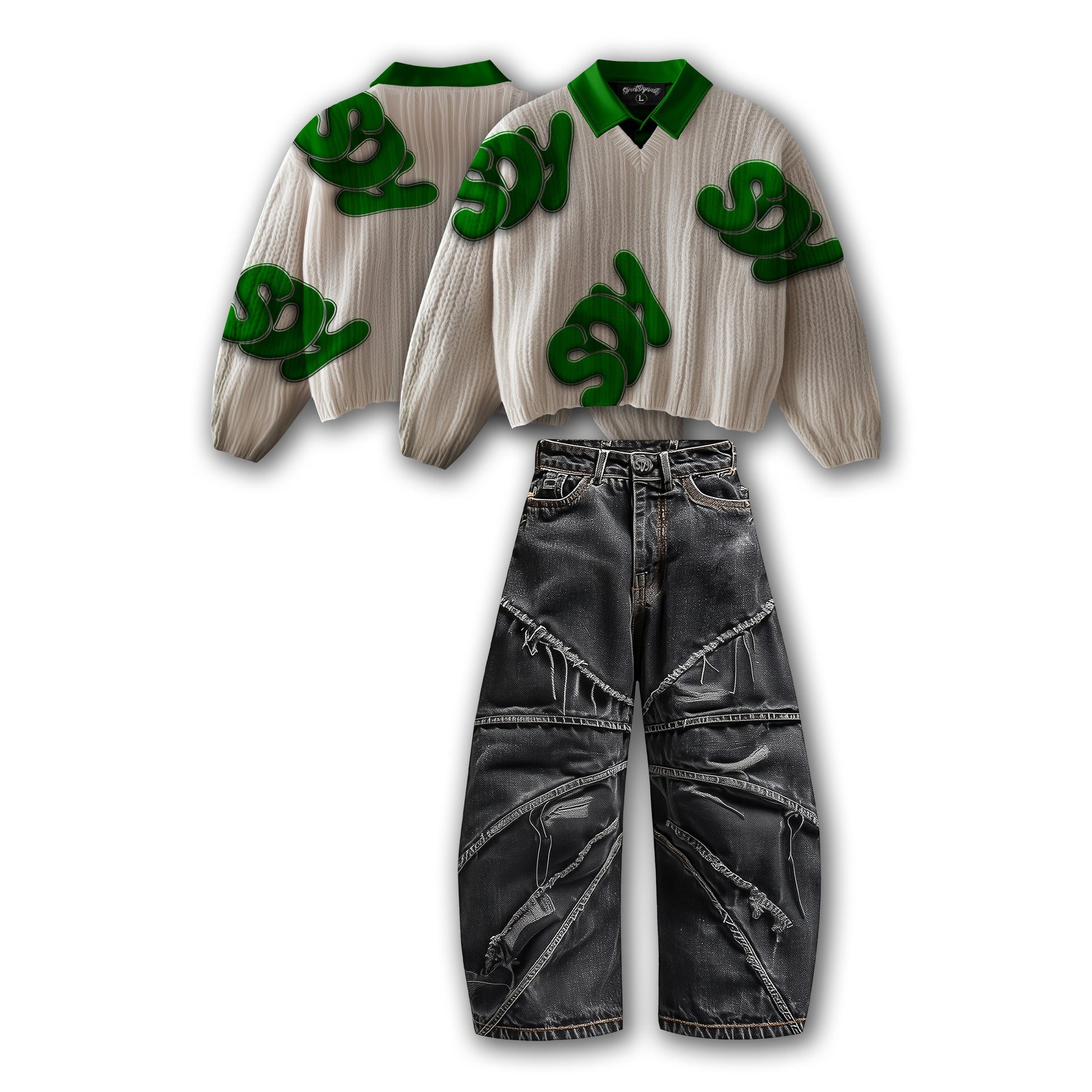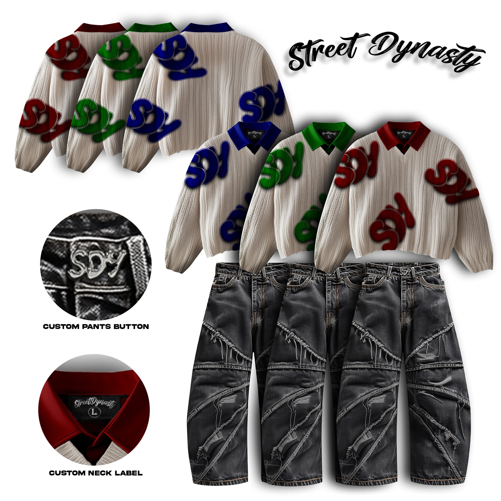 This Custom Knitted Sweater Set combines quality craftsmanship with practical design. The V-neck sweater features a built-in collar for added structure, paired with comfortable baggy jeans that prioritize ease of movement. Finished with a distinctive SDY button detail, the set delivers both style and wearability for everyday wear.